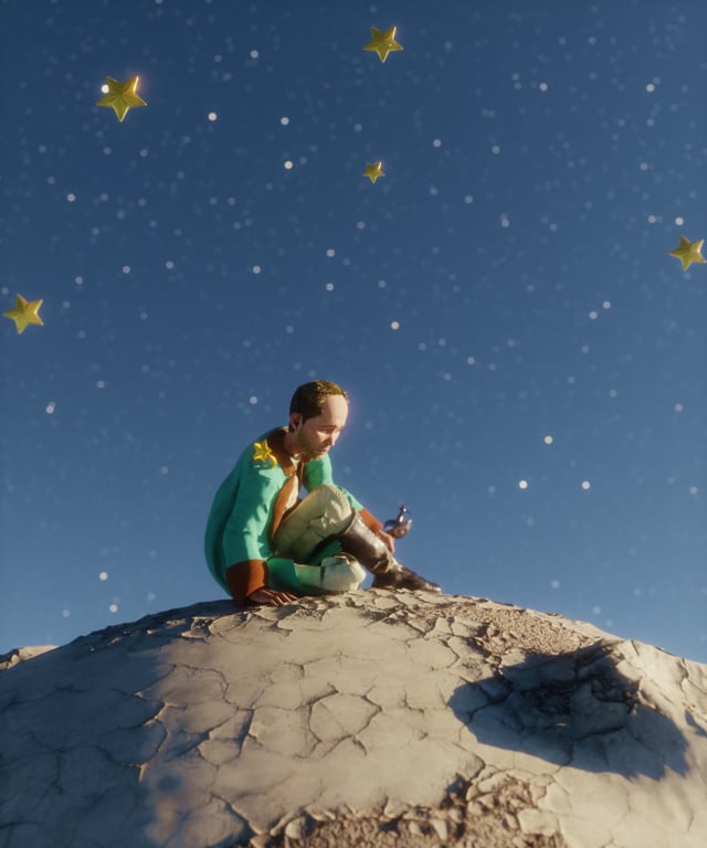 옛날 옛적 우리 마음속에는 어린 왕자가 있었다. 그러나 나이가 들고 시간이 흐르면서 어린 왕자의 순수함은 사라지고 변해버린 왕자의 모습만 남았다. 현실의 무게로 인해 지쳐버린 왕자는 한때 순수했던 어린 시절의 우리를 다시금 되돌아보게 한다. 장미 간판의 네온 불빛과 깨진 유리병 속에 담긴 말린 장미는 산업화로 인한 급격한 변화를 상징하고, 동전에 대한 탐욕에 쫓기는 뱀은 우리를 경계하며 위협을 가한다. 계속되는 전쟁 속을 걷는 여우의 모습은 세계의 가혹한 현실을 보여주고 있다. 하지만 현대 사회의 혼란에도 불구하고 늙은 왕자는 씩씩하게 나아가며 관객에게 지구라는 별을 소개한다. 이 서사를 통해 작품은 순수의 상실, 경험의 무게, 불확실한 세상에 필요한 지속적인 용기에 대해 성찰한다. 늙은 왕자는 이전과 달라진 현실에도 불구하고 우리가 소중히 여겼던 순수함의 흔적이 여전히 남아 있음을 상기시켜 준다.