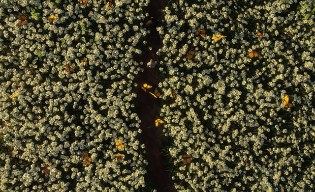 꽃밭을 지나가는 작은 사람들의 행렬은 조용하고 평화로운 여정을 보여준다. 꽃길 끝에 도달하면 장면은 도시 건물의 숲으로 전환된다. 자연의 평온함에서 경직된 공간으로의 미묘한 전환과 도시 풍경의 인공적 구조물은 씁쓸한 느낌을 불러일으킨다. 이는 자연이 주는 잠시의 휴식이 사라지고, 우리가 현재의 존재를 정의하는 공간인 도시 생활의 리듬으로 돌아갈 수밖에 없음을 상기시킨다. 이 작품은 자연 세계와 인공 환경의 대비를 강조하며 탈출과 피할 수 없는 귀환 사이의 미묘한 긴장감을 보여준다.