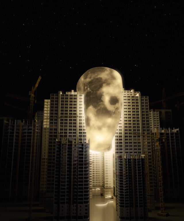이렇게 우뚝 솟은 건물들은 울창한 콘크리트 숲을 만들어 하늘을 가리고 공간과 자연의 상실을 낳고 있다. 이제 하늘을 볼 수 있는 가능성은 청약 복권을 통해 아파트를 확보하는 것만큼이나 어렵고 불확실하게 느껴진다. 작품 속 보름달은 도시화가 어떻게 사람들을 단순하고 근본적인 경험으로부터 멀어지게 했는지에 대한 은유적 역할을 한다. 사람들이 아파트 신청 결과를 애타게 기다리는 것처럼, 한때는 일상적이었지만 이제는 광범위한 도시 개발로 인해 가려진 달의 모습을 볼 수 있기를 희망하고 기도해야 한다는 것을 시사한다. 이 풍자적 작품은 과도한 개발로 인한 사회적, 문화적 결과를 반영하고 도시 생활과 자연 사이의 단절이 점점 커지고 있음을 강조한다. 또한 환경 보존과 정서적 안녕보다 물질적 열망을 우선시하는 현대 사회에 대한 비판적 시선을 보여주며 통제되지 않은 도시화가 풍경과 인간 정신 모두에 미치는 장기적인 영향을 생각하도록 한다.