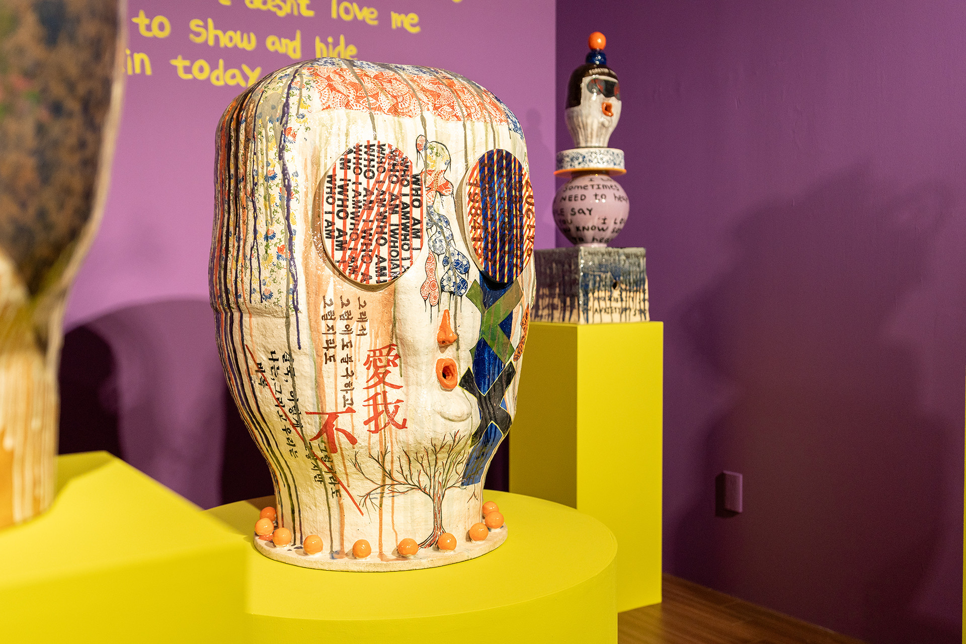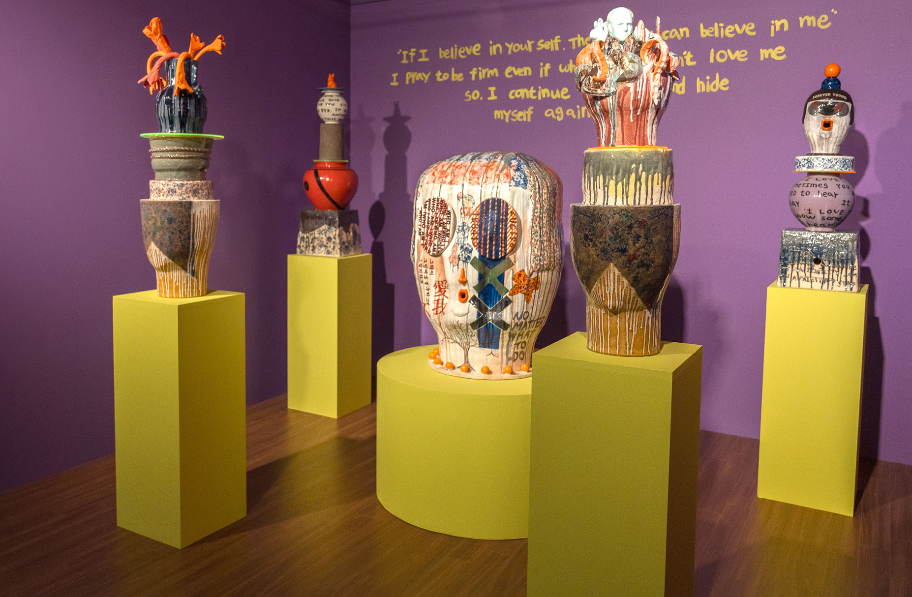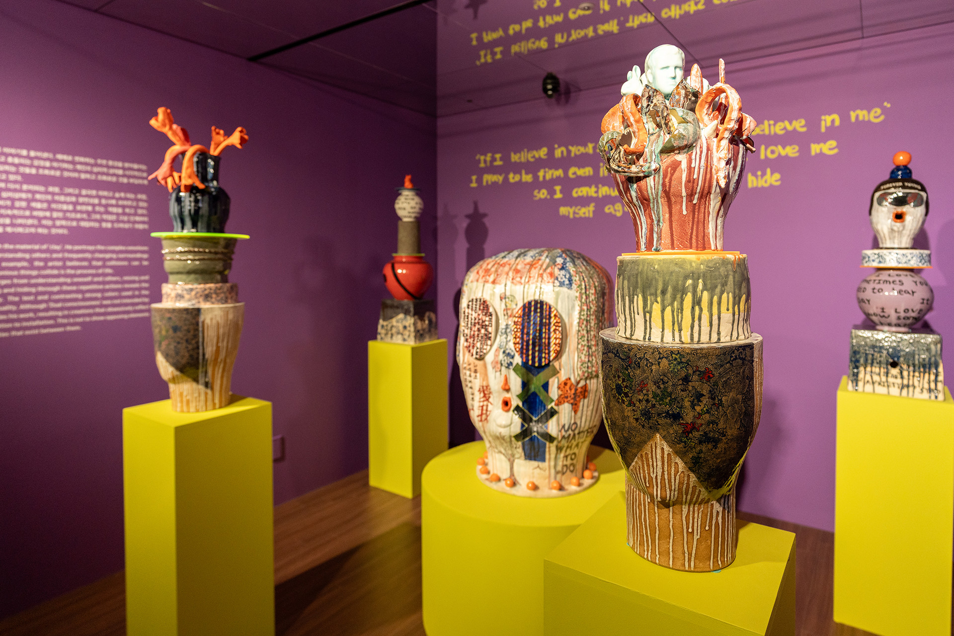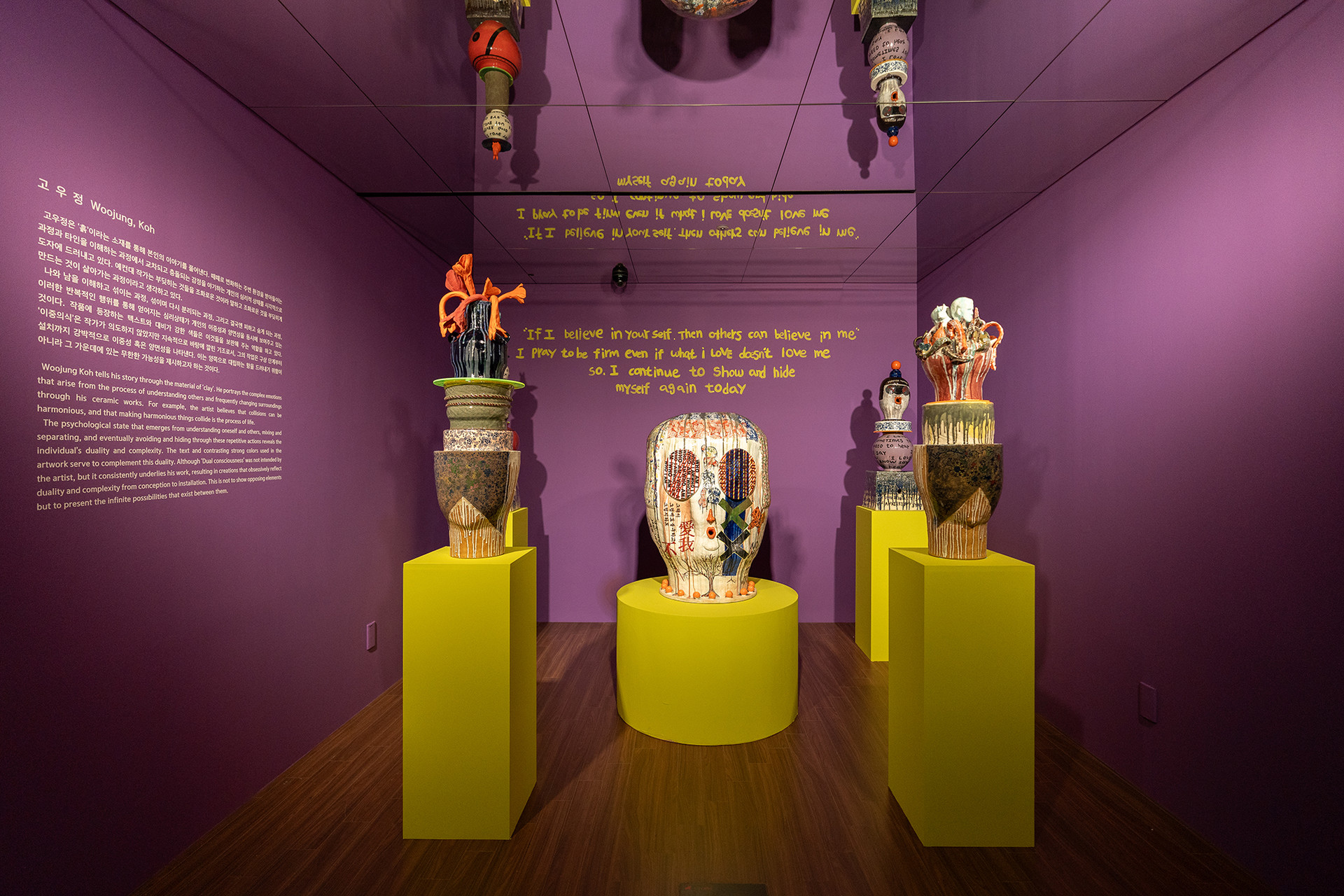 고우정은 ‘흙’이라는 소재를 통해 본인의 이야기를 풀어낸다. 때때로 변화하는 주변 환경을 받아들이는 과정과 타인을 이해하는 과정에서 교차되고 충돌되는 감정을 야기하는 개인의 심리적 상태를 시각적으로 도자에 드러내고 있다. 예컨대 작가는 부딪히는 것들을 조화로운 것이라 말하고 조화로운 것을 부딪치게 만드는 것이 살아가는 과정이라고 생각하고 있다. 나와 남을 이해하고 섞이는 과정, 섞이며 다시 분리되는 과정, 그리고 결국엔 피하고 숨게 되는 과정, 이러한 반복적인 행위를 통해 얻어지는 심리상태가 개인의 이중성과 양면성을 동시에 보여주고 있는 것이다. 작품에 등장하는 텍스트와 대비가 강한 색들은 이것들을 보완해 주는 역할을 하고 있다. ‘이중의식’은 작가가 의도하지 않았지만 지속적으로 바탕에 깔린 기조로서, 그의 작업은 구상 단계부터 설치까지 강박적으로 이중성 혹은 양면성을 나타낸다. 이는 양쪽으로 대립하는 항을 드러내기 위함이 아니라 그 가운데에 있는 무한한 가능성을 제시하고자 하는 것이다.