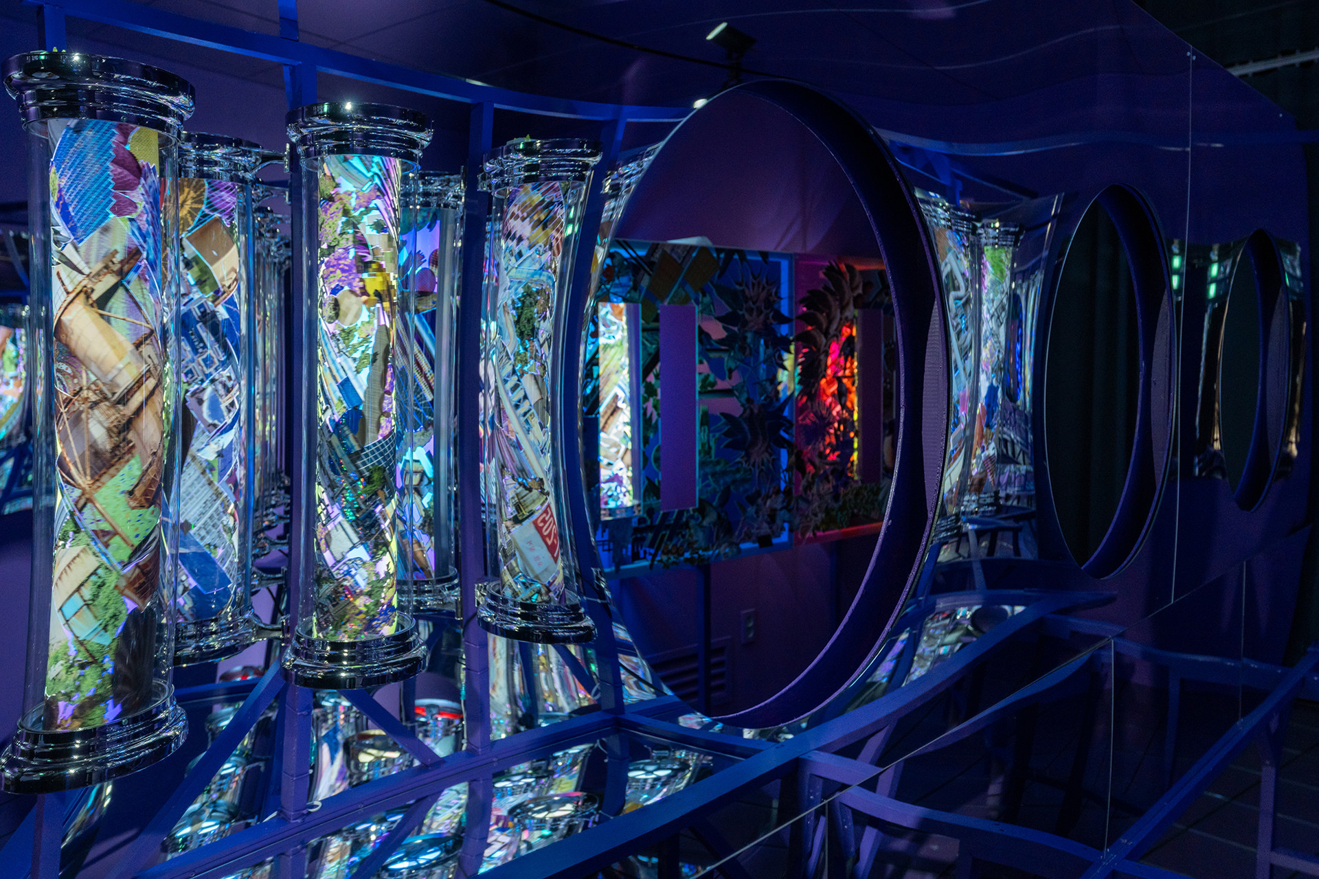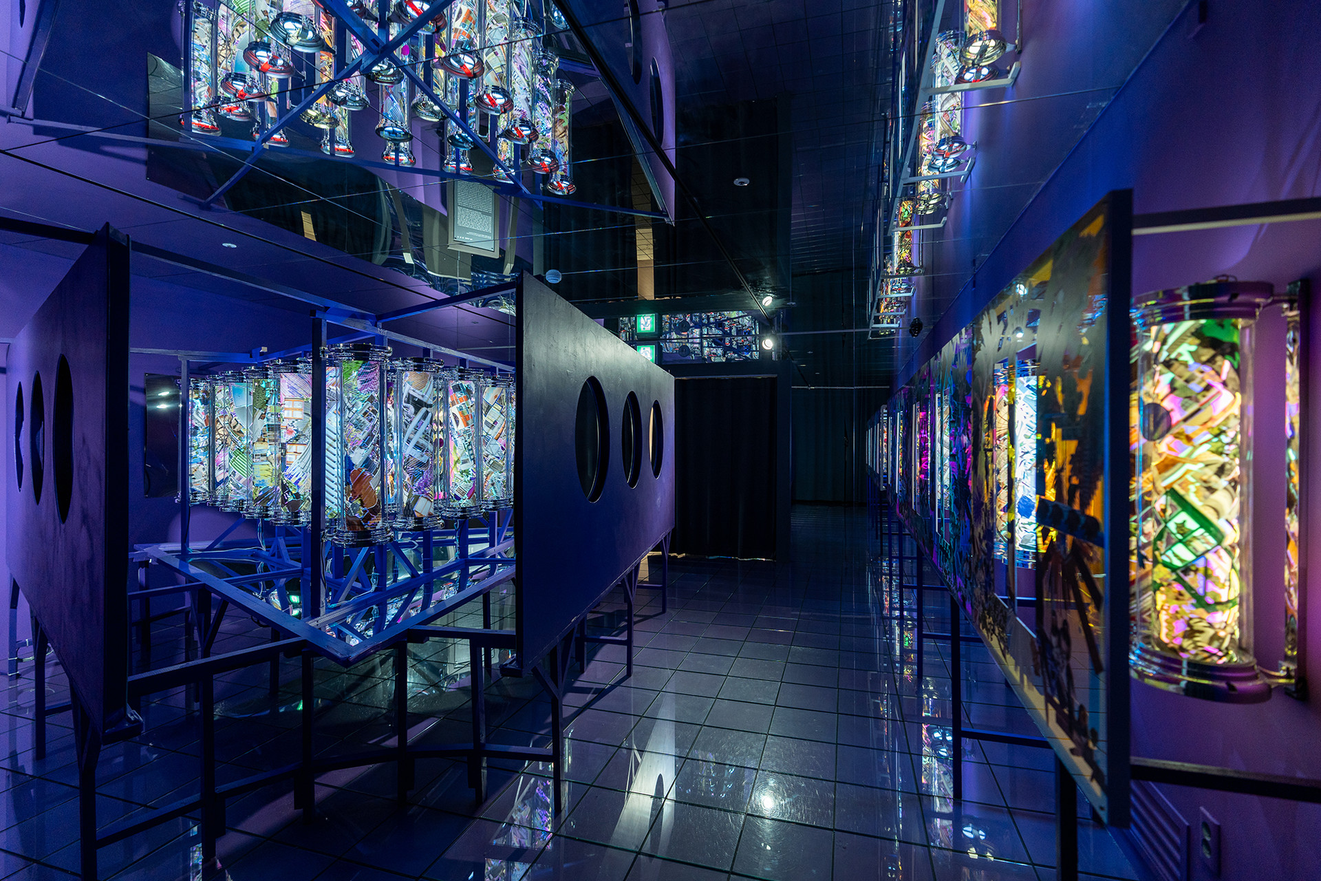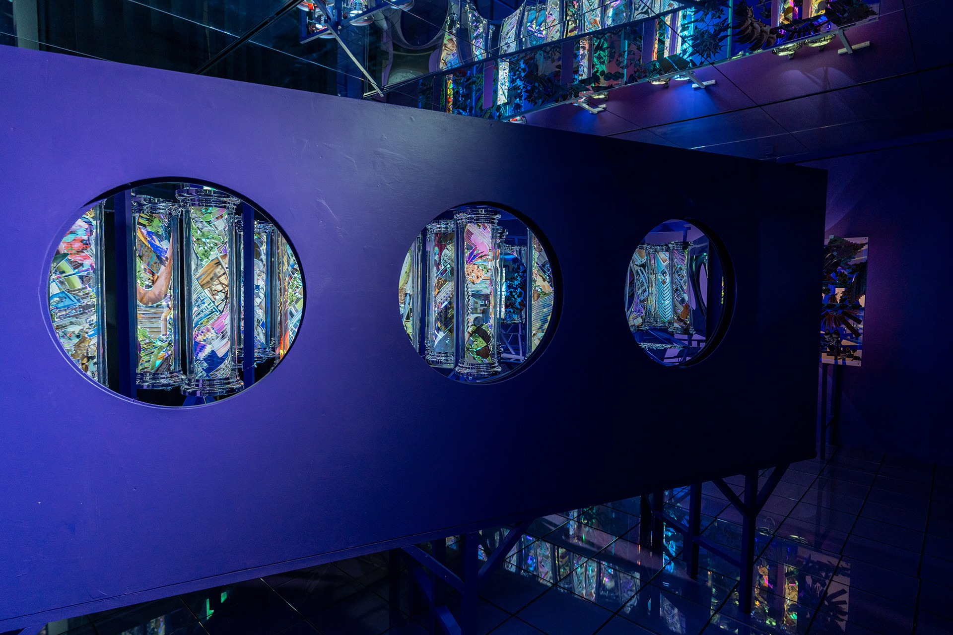 구지은은 개개인의 파편화된 기억의 집결을 통해 다양한 경계가 교차하는 ‘장소’와 그곳을 둘러싸고 있는 환경적 요소에 관심을 두며, 그 안에서 존재해 왔던 대상들을 채집하고 연결하는 작업을 진행하고 있다. <견인된 땅>은 한 마을이 공동으로 살아가는 생업의 기반이자 삶의 방식으로 존재했던 주체들의 삶과 노동을 상기시킨다. 나아가 마을과 이웃에 대한 기억의 기록을 통해 우리 사회의 보이지 않는 지점을 가시화하고 새롭게 지각되는 현대의 장소성을 드러내고 있다. 이는 도시화와 환경의 변화에 의해 파생되는 사회현상 속에서 무관심했던 대상들을 아카이브하고 파편화된 기억들을 연결하여 새로운 장소적 경험으로서 제시한다. 작가는 이를 위해 물리적인 해체와 접합의 노동집약적인 방식으로 이미지를 파편화시켜 회전하는 싸인볼에 콜라주 하며 표현한다. 그리고 이를 하나의 연결된 구조물과 결합하여 장소에 대한 복잡한 층위들이 혼재된 기하학적 형상의 경계 장면을 연출한다. 이는 도시의 발광하는 스펙터클을 더욱 극적으로 보여준 것으로 주변의 관계망을 통해 공동의 기억으로 새롭게 지각되는 장소적 환경을 드러낸다.
