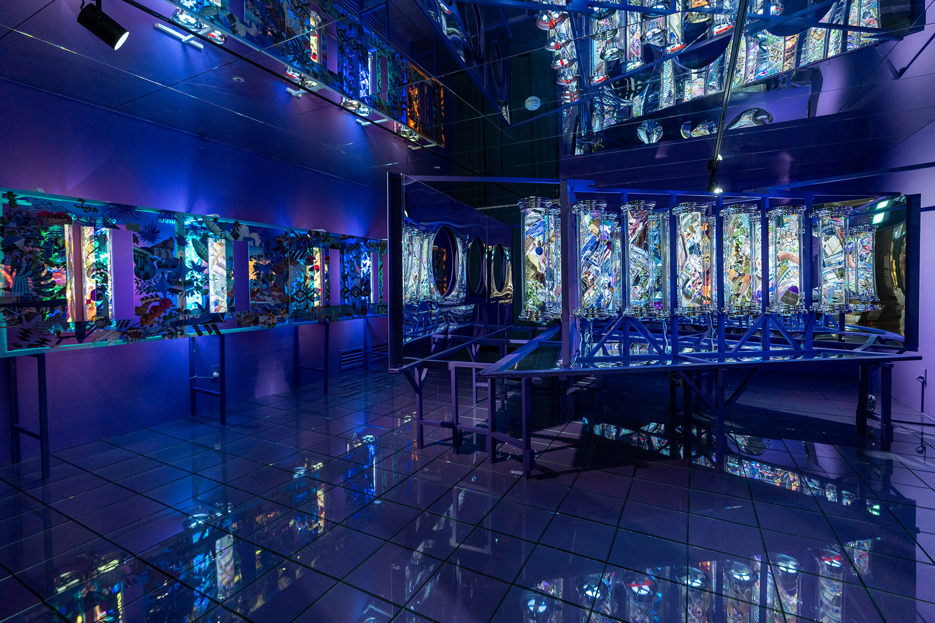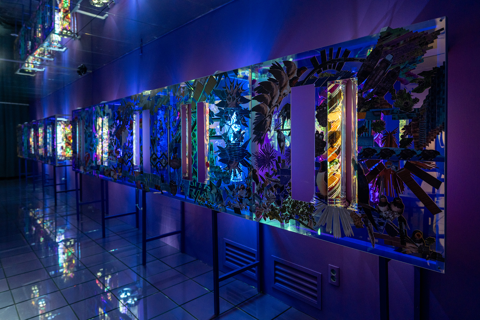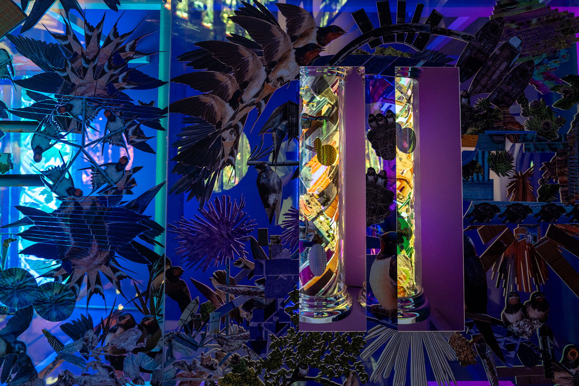 구지은은 개개인의 파편화된 기억의 집결을 통해 다양한 경계가 교차하는 ‘장소’와 그곳을 둘러싸고 있는 환경적 요소에 관심을 두며, 그 안에서 존재해 왔던 대상들을 채집하고 연결하는 작업을 진행하고 있다. <견인된 땅>은 한 마을이 공동으로 살아가는 생업의 기반이자 삶의 방식으로 존재했던 주체들의 삶과 노동을 상기시킨다. 나아가 마을과 이웃에 대한 기억의 기록을 통해 우리 사회의 보이지 않는 지점을 가시화하고 새롭게 지각되는 현대의 장소성을 드러내고 있다. 이는 도시화와 환경의 변화에 의해 파생되는 사회현상 속에서 무관심했던 대상들을 아카이브하고 파편화된 기억들을 연결하여 새로운 장소적 경험으로서 제시한다. 작가는 이를 위해 물리적인 해체와 접합의 노동집약적인 방식으로 이미지를 파편화시켜 회전하는 싸인볼에 콜라주 하며 표현한다. 그리고 이를 하나의 연결된 구조물과 결합하여 장소에 대한 복잡한 층위들이 혼재된 기하학적 형상의 경계 장면을 연출한다. 이는 도시의 발광하는 스펙터클을 더욱 극적으로 보여준 것으로 주변의 관계망을 통해 공동의 기억으로 새롭게 지각되는 장소적 환경을 드러낸다.