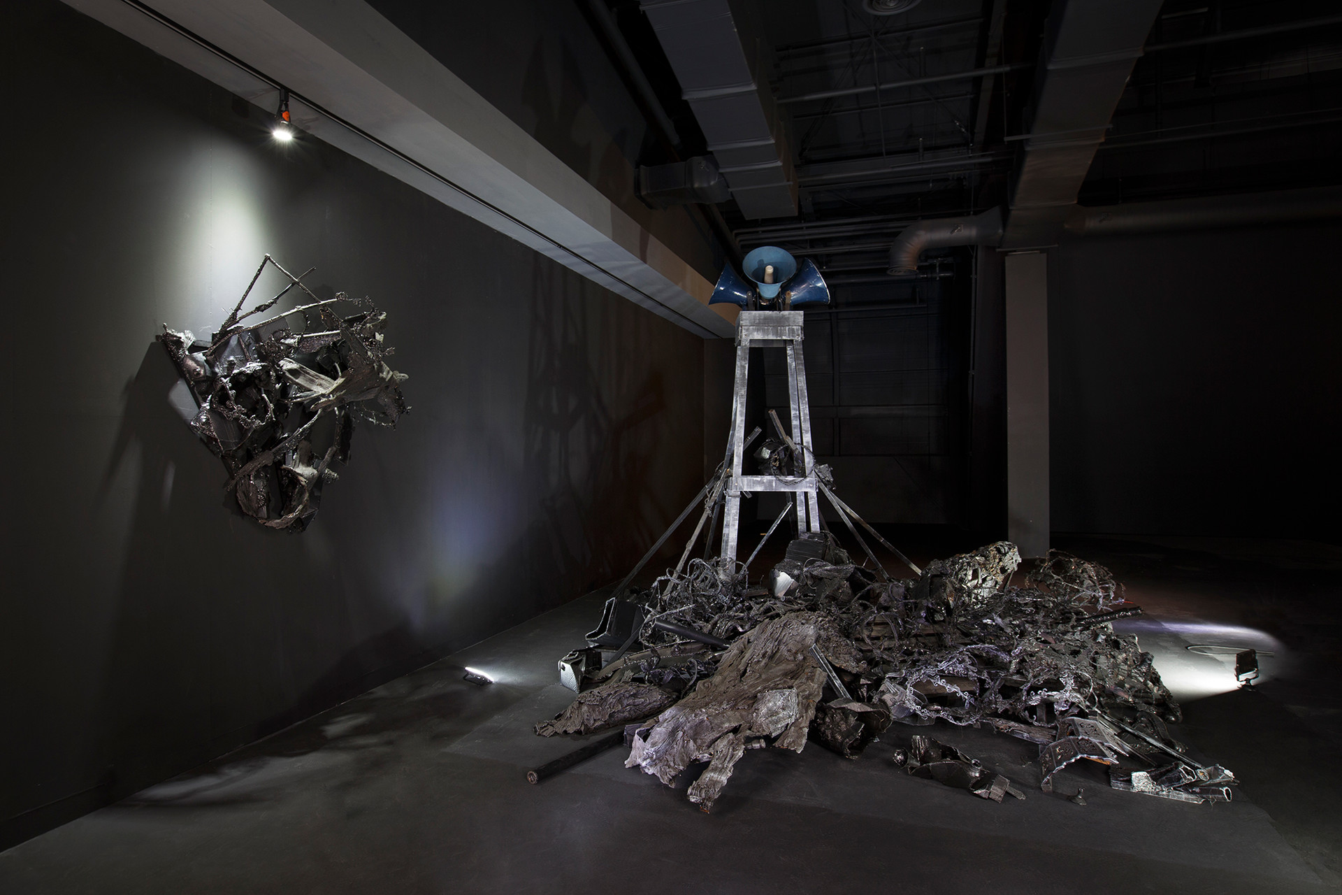 심승욱은 자신이 속한 세계 속에서 공유 된 경험과 현상을 바탕으로 하는 현실을 직시하며 경직된 구조 속에서 자리한 규정할 수 없는 인간의 감정에 주목한다. <구축 혹은 해체 – 부재와 임재 사이>에서 부재와 임재는 존재하는 대상이 이 세계 속에 자리 하는 방식으로 이해 할 수 있다. 이 작업은 짓다 말고 버려진 미완성의 구조물인 듯한 느낌을 주기도 하고, 어딘지 무겁고 불안한 기