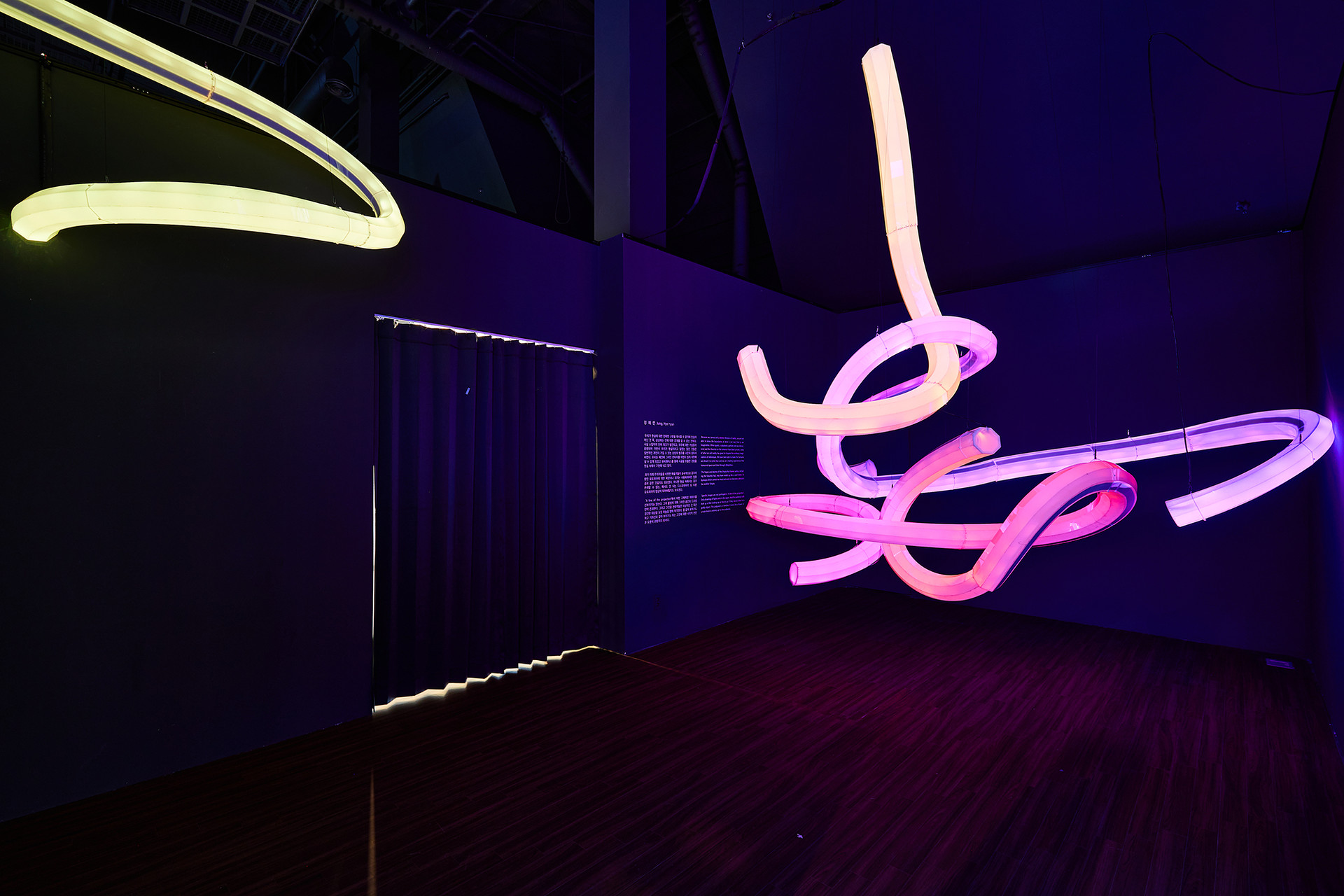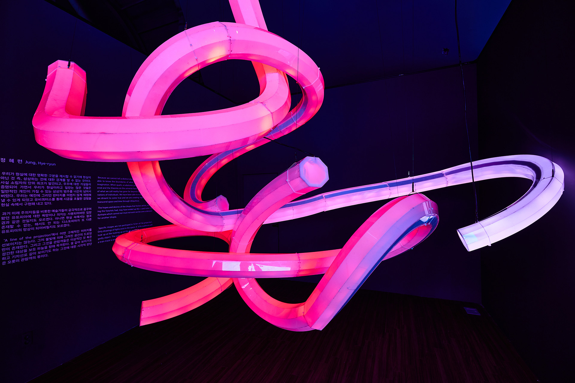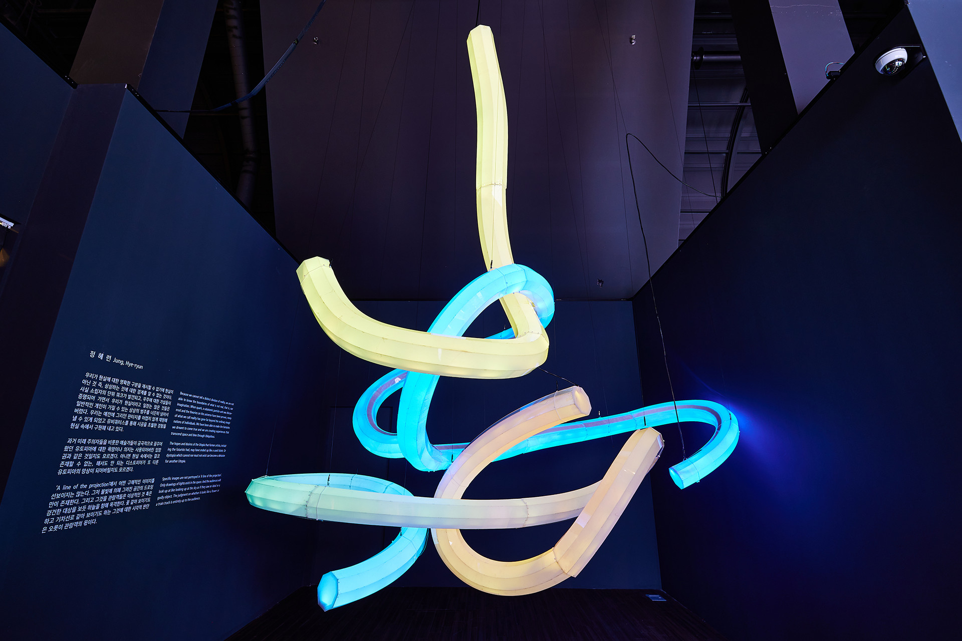 우리가 현실에 대한 명확한 구분을 제시할 수 없기에 현실이 아닌 것 즉, 상상하는 것에 대한 경계를 알 수 없는 것이다. 사실 소립자의 단위 쿼크(quak)가 발견되고, 우주에 대한 가설들이 증명되어 가면서 우리가 현실이라고 일컫는 많은 것들은 일반적인 개인이 가질 수 있는 상상의 범주를 너끈히 넘어서 버렸다. 우리는 예전에 그리던 판타지를 어렵지 않게 재현해 낼 수 있게 되었고 유비쿼터스(Ubiquitos)를 통해 시공을 초월한 경험을 현실 속에서 구현해 내고 있다. 과거 미래 주의자들을 비롯한 예술가들이 궁극적으로 꿈꾸어왔던 유토피아에 대한 욕망이나 의지는 사용되어버린 입장권과 같은 것일지도 모르겠다. 아니면 현실 속에서는 결코 존재할 수 없는, 해서도 안 되는 디스토피아가 또 다른 유토피아의 망상이 되어버릴지도 모르겠다. ‘예상의 경계’에서 어떤 구체적인 이미지를 선보이지는 않는다. 그저 불빛에 의해 그려진 공간의 드로잉만이 존재한다. 그리고 그것을 관람객들은 이상적인 것 혹은 경건한 대상을 보듯 하늘을 향해 목격한다. 꽃 같아 보이기도 하고 기차선로 같아 보이기도 하는 그것에 대한 시각적 판단은 오롯이 관람객의 몫이다.